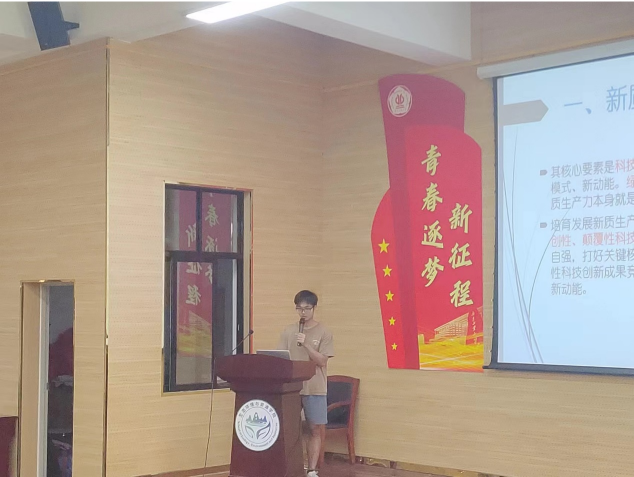 二组进行了汇报,他表示,具有高科技、高效能、高质量等特征的新质生产力拥有新时代所面对的机遇与挑战,而重要的是我们青年学子在面对这新背景下该如何应对。