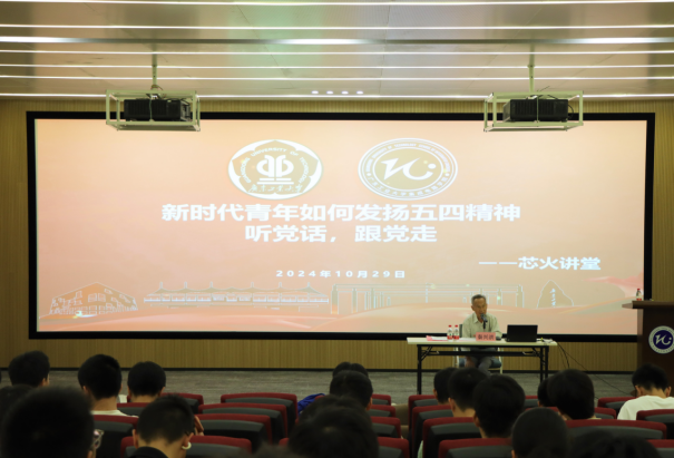 为深入学习贯彻习近平新时代中国特色社会主义思想,特别是习近平总书记关于教育的重要论述,全面贯彻党的二十大精神,深入贯彻中办、国办《关于加强新时代关心下一代工作委员会工作的意见》,充分发挥“五老”(老干部、老战士、老专家、老教师、老模范)的优势,教育引导广大青年学生树立坚定的理想信念,矢志奉献国家和人民,为建设教育强国奉献青春和力量。10月29日下午,校关工委“五老”报告团成员秦兴洪教授受邀做客学院特色活动“芯”火讲堂,作了主题为“新时代青年如何发扬五四精神,听党话、跟党走”的主题讲座。学院青马班学员、团学骨干等150余名同学齐聚理学馆学术报告厅,学院党委副书记石宇杰出席本次活动。本次讲座由学生会秘书长谢松强老师主持。