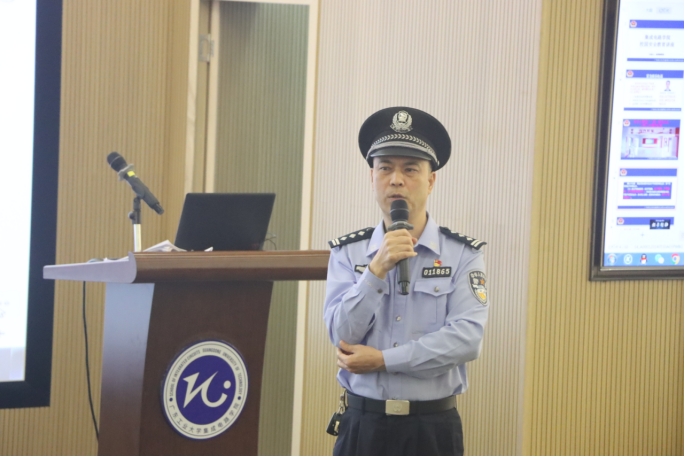 学院党委副书记石宇杰首先代表学院对陈林群警官的到来表示感谢,他重点强调了校园安全的重要性,希望同学们主动了解诈骗手段,提升自身的风险防范意识,同时将今天所学到的内容传达给身边的同学,让防诈反诈深入人心。