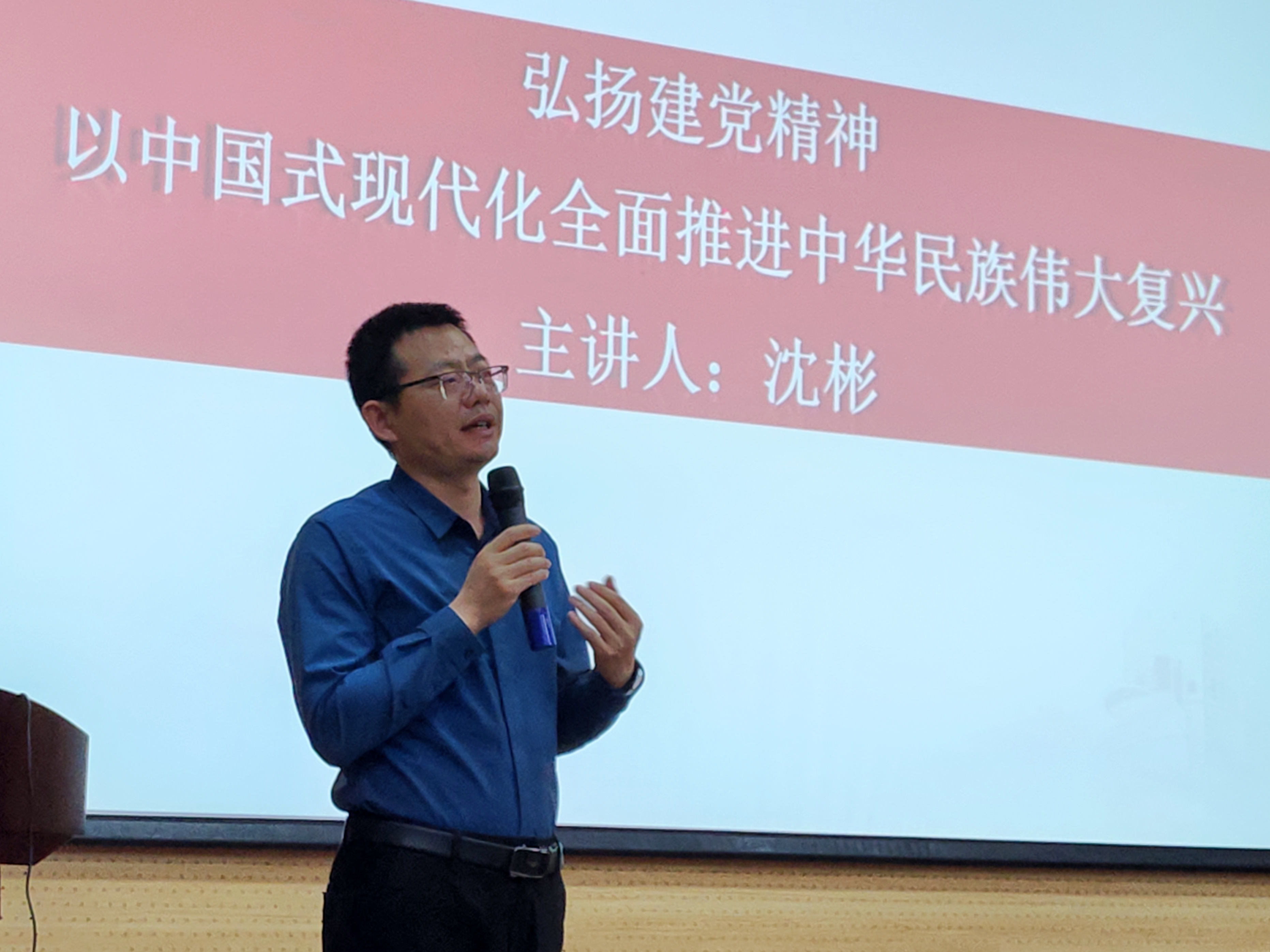 开班仪式结束后,沈彬书记为学员们讲授第一堂理论课:以“弘扬建党精神,以中国式现代化全面推进中华民族伟大复兴”为主题,围绕“学习宣传贯彻党的二十大精神的重大意义”、“全面准确学习领会党的二十大精神的几个方面”、“弘扬建党精神”、“中国式现代化的科学内涵及本质要求”、“中国式现代化的动力”、“中国式现代化的世界意义”六个方面展开阐述,对“坚持真理、坚守理想”,“践行初心、担当使命”,“不怕牺牲、英勇斗争”,“对党忠诚、不负人民”等建党精神做了着重讲解,同时沈彬书记聚焦“为什么要提出中国式现代化?”“中国式现代化‘特’在哪里?”两个问题,对“中国式现代化的科学内涵及本质要求”进行解答,指出中国式现代化是中国共产党领导的社会主义现代化,既有各国现代化的共同特征,更有基于自己国情的中国特色。沈彬书记还从入党誓词的演变进一步强调了对党忠诚的重要性。