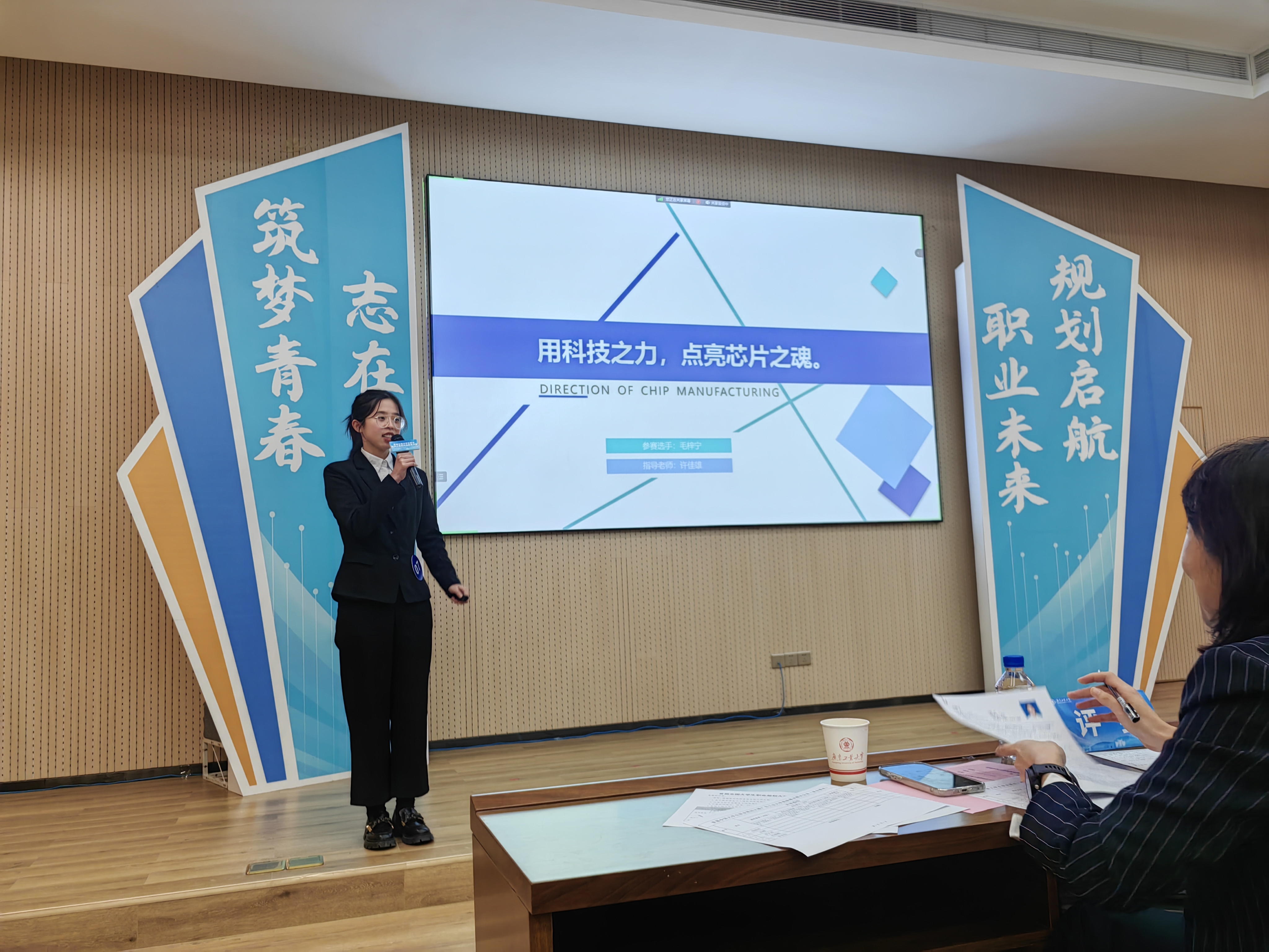 决赛现场,毛梓宁同学以“用科技之力,点亮芯片之魂”为题,向评委老师以及同学们展示了她立志成为一名半导体工艺研发工程师,为国家集成电路行业“卡脖子”技术贡献青春力量的炽热之心。她计划通过进一步的实践锻炼与企业学习,不断提高自身的专业素养和综合能力,在半导体领域闯出一片广阔天地。