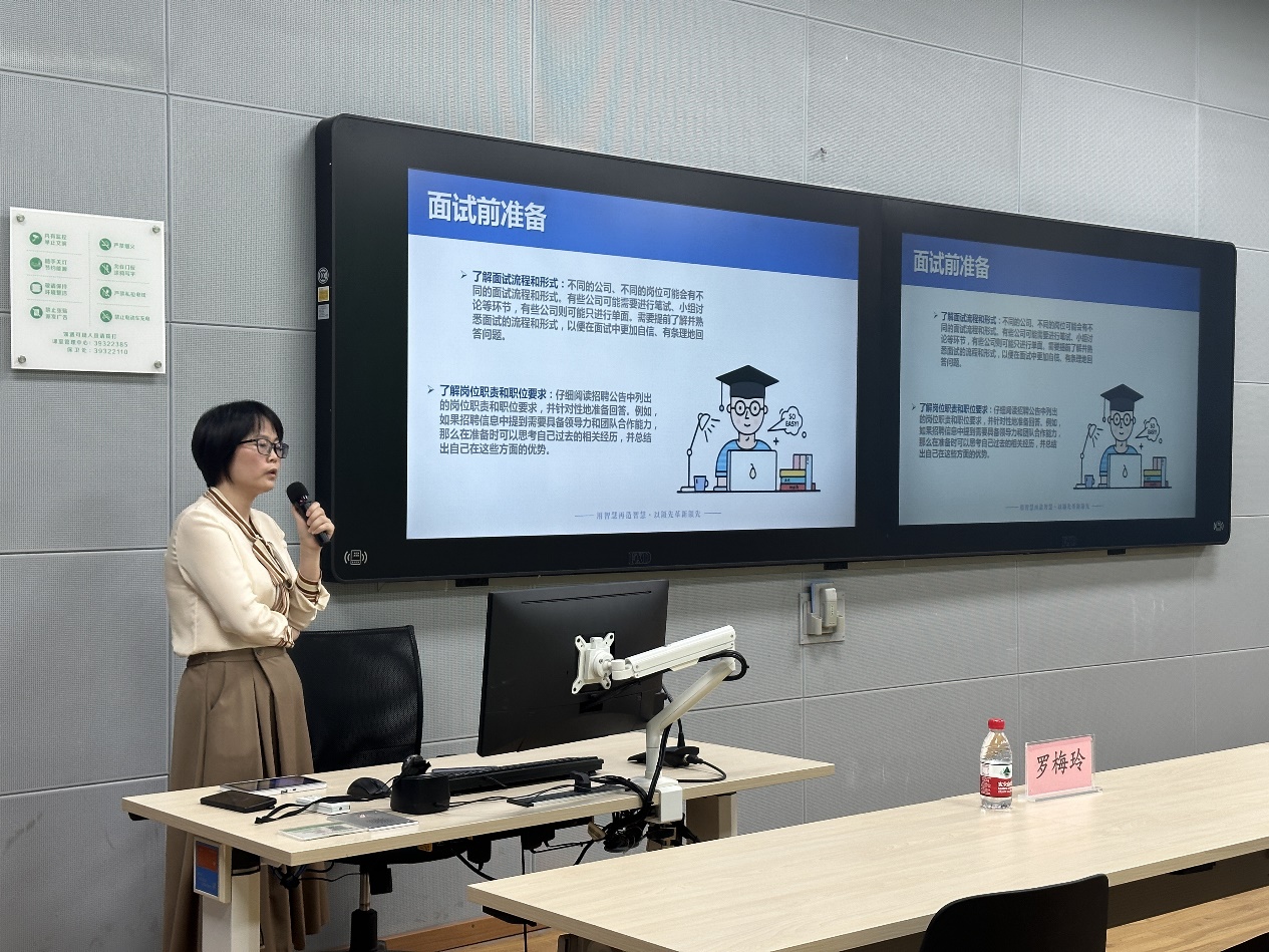 珠海天成先进半导体科技有限公司的人力资源主管——刘晓艳女士以“校招面试秘籍拆解”为主题,以面试前准备、面试礼仪、面试过程及面试后总结四点为大纲,不仅详细地示范了个人形象、行为举止和沟通方式等礼仪技巧,还根据四大面试类型,逐一拆解面试细节、面试大致内容及应对技巧,并且在最后提出“面试后总结”这一观点,讲解了其重要作用,促进学生提高自我总结提升的能力。接着刘晓艳女士为学员们讲述了其本人所在公司的发展状况,为学员们提供了近距离了解企业实际情况的宝贵机会。