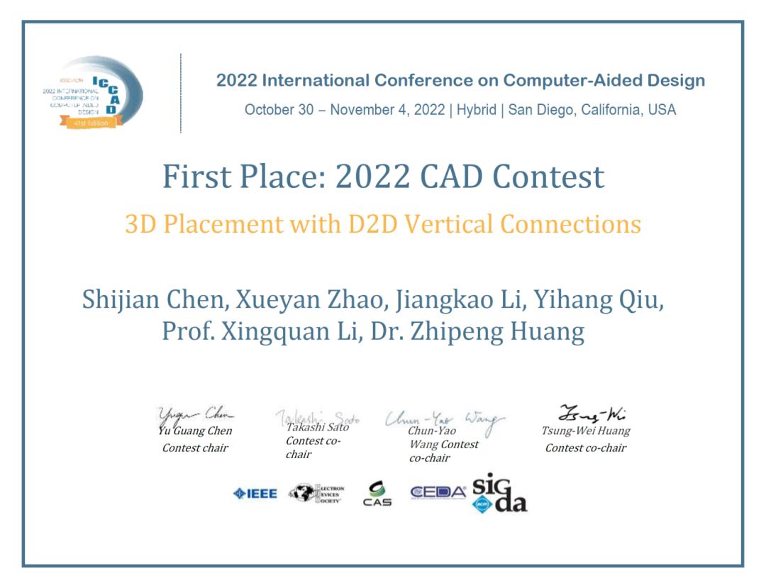 联合鹏城实验室、中科院计算所和闽南师范大学的iEDA 3Dplacer团队(我校研究生邱奕杭同学参与)获得了该项赛事三大赛道之一的第一名。本届CAD Contest@ICCAD算法竞赛共有来自国内外知名高校与研究机构的166支队伍参与,如东京大学、台湾大学、香港中文大学、北京大学、台湾清华大学、德州大学奥斯汀分校、复旦大学等。
