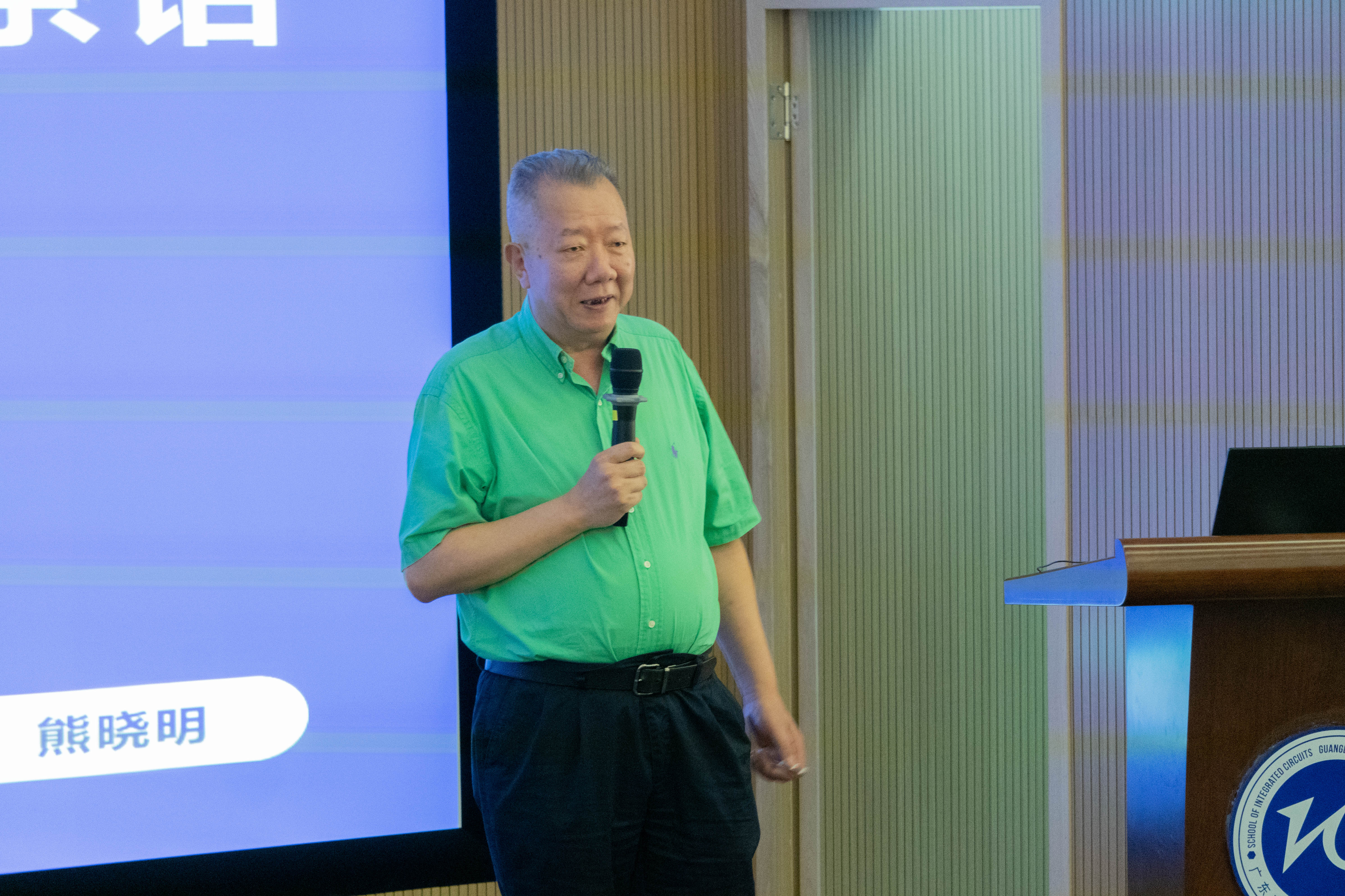 在承载了两年青春记忆的班级自制回忆录视频播放完毕后,学位授予仪式正式拉开帷幕。首先,院长熊晓明上台发言,从国内外科研,产业的角度分析了集成电路领域的发展历史与现状,从国家和社会的层面阐述了人才培养的重要性,并对IC班毕业生表达了祝贺与寄托。接着,班主任符哲老师寄语本届毕业生,对他们表达了充分的肯定和赞扬,并希望同学们未来自谦但不自鄙,自信但不自满,自律但不自苛。最后,由熊晓明和符哲共同为本届IC班毕业生颁发联合培养证书与纪念品,并合影留念。