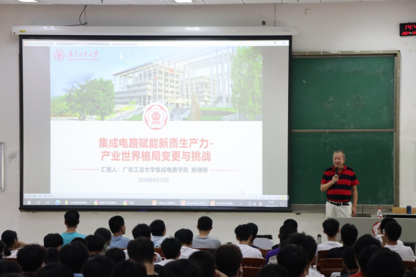 为引领学院新生了解集成电路领域的科技前沿和发展动态,激发他们对集成电路的浓厚兴趣与未来憧憬。9月13日下午,精彩纷呈的《工程导论》课在大学城校区5号大教室开课了。学院院长熊晓明教授亲临现场,以“集成电路赋能新质生产力——产业世界格局变更与挑战”为主题,为学院229名本科新生讲授《工程导论》第一课。