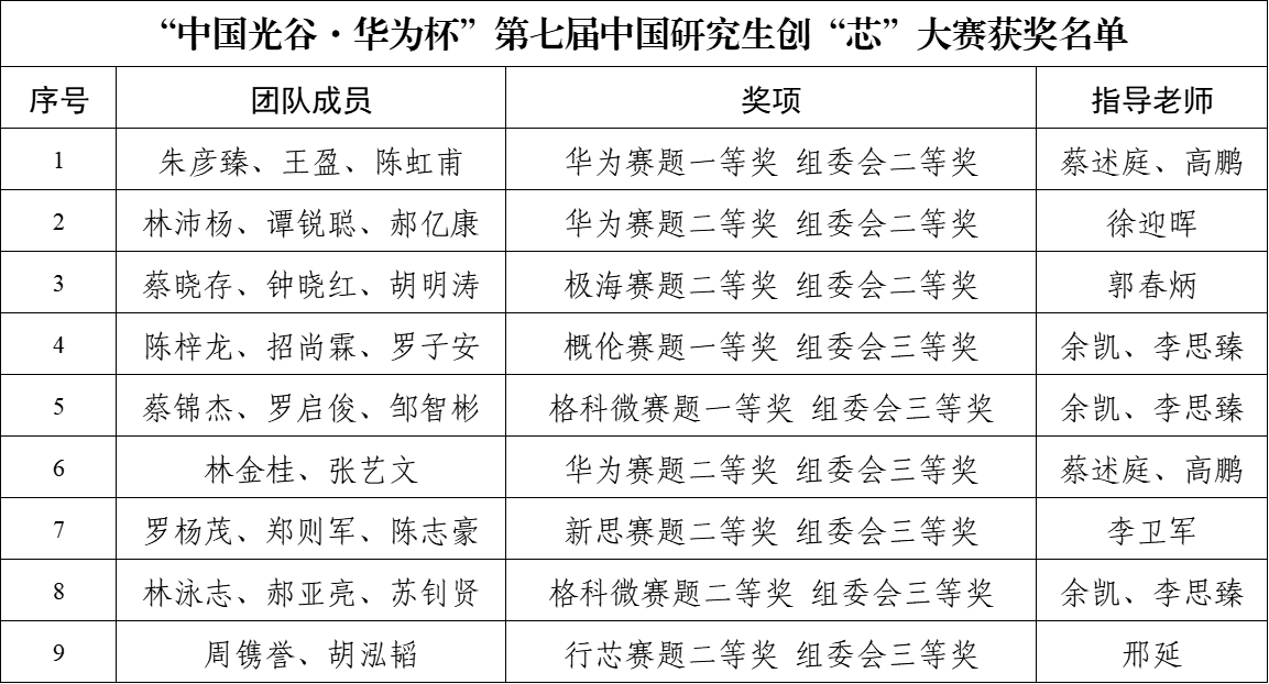 8月14日至16日,“中国光谷·华为杯”第七届中国研究生创“芯”大赛决赛在华中科技大学举行。我校参赛队伍精心准备,沉着应战、表现出色。经过三天的比赛评审、激烈角逐,我校队伍荣获国赛二等奖3项,三等奖6项;同时获得企业赛道:华为赛题一等奖1项、二等奖2项,极海赛题二等奖1项,概伦赛题一等奖1项,格科微赛题一等奖1项、二等奖1项,新思赛题二等奖1项,行芯赛题二等1项,刷新了我校在该赛事的最好成绩。我校获优秀组织奖